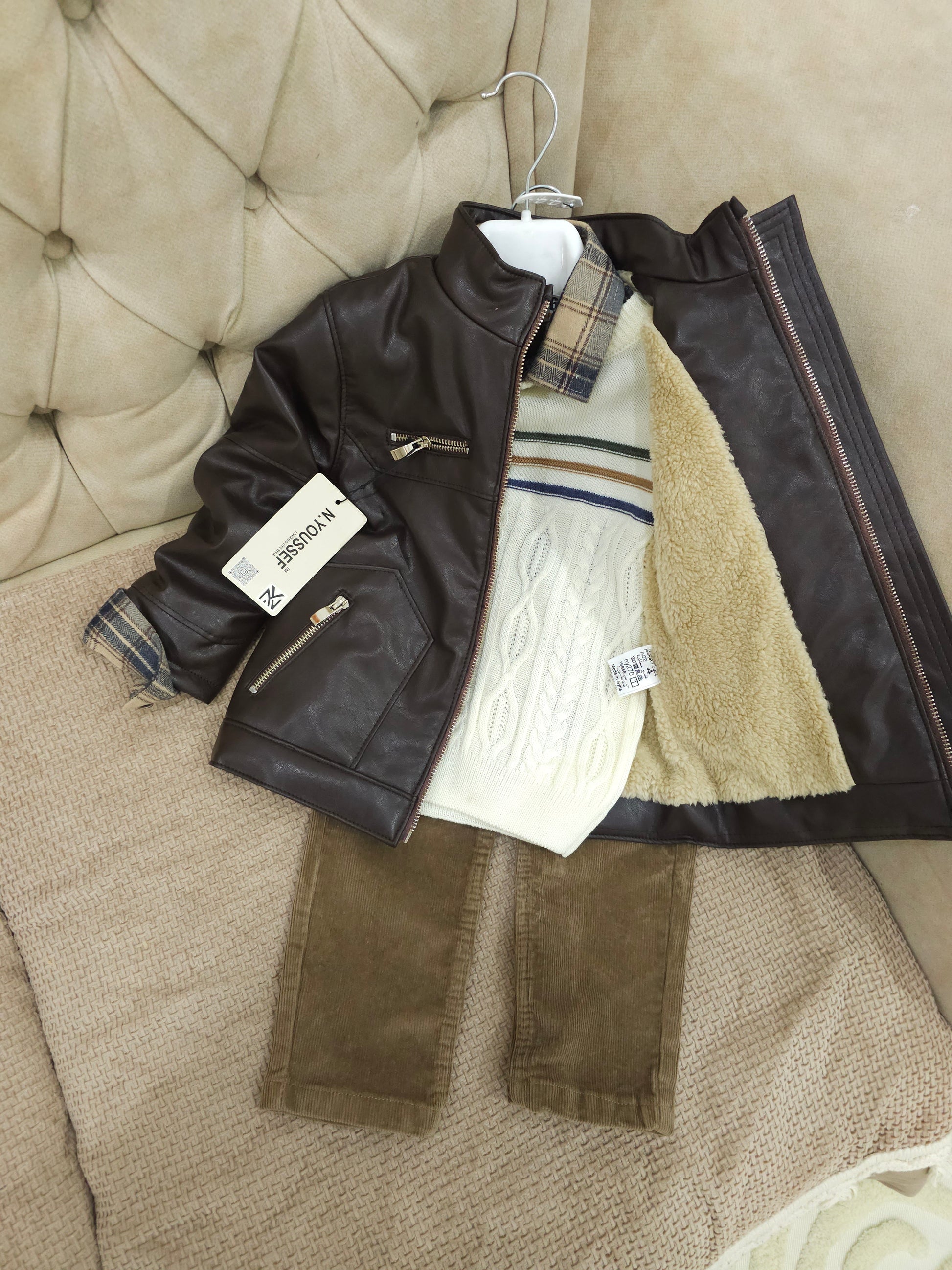 (كوفي ) طقم ولادي ٤ قطع قمصلة جلد مبطن